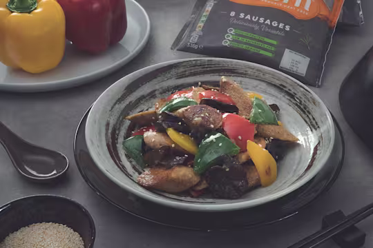 They say that each meal we eat should contain at least three different colours to make sure we’re getting enough of the right nutrients - and this meal really is the whole rainbow! Red, green and yellow capsicum accompany protein-rich Quorn Sausages and exotic black fungus for a traditional flavour hit.