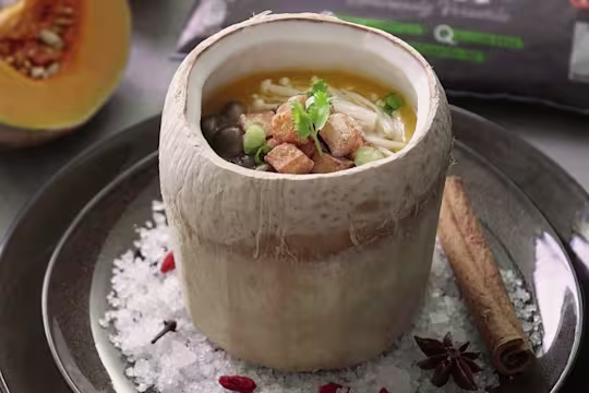 - Ladle soup into steamed whole coconut and top with crispy Quorn Meat Free Pieces.