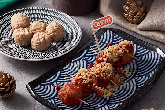 - Skewer the Quorn Swedish Balls, pouring the sauce and breadcrumb mixture over them.