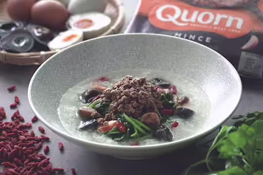 - Add fried garlic, Quorn Meat Free Mince, salted egg yolk and century egg. Mix well